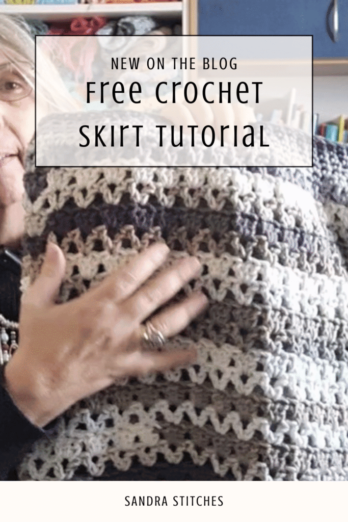Hold the skirt against your body every few rounds. I worked approximately 11–12 rounds per skein panel (what I call a “skin”), and each panel measured around 8 inches in length. Two panels = roughly 16 inches total before blocking. Remember that chunky V-stitch fabric will grow in length when blocked — sometimes by several centimetres.