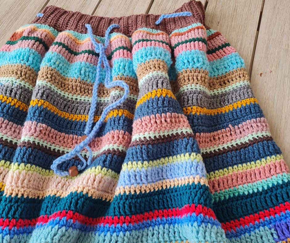 I made a skirt from scrap yarn. Different colors, different textures, it came out really pretty. My plan was to add elastic around the waist.