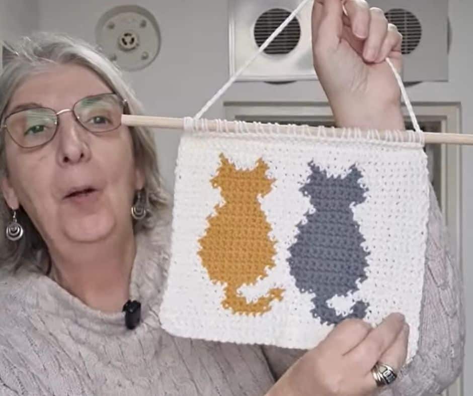 I had a tapestry crochet wall hanging of two cats, worked in tapestry crochet, almost finished. It just needed a wooden dowel so it could hang properly.